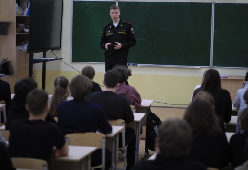 Участник программы «Защитники. Под крылом Архангела» Александр Елуков встретился в учащимися лицея имени М.В. Ломоносова