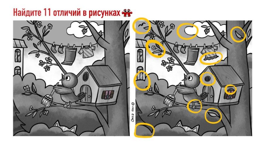 Этот птенчик готовится к холодному сезону и расхламляет свое жилище. Он уже перестирал все нужные вещи, почистил перышки и теперь подметает крыльцо. Для нас это, конечно, ветка, но для него — точно крыльцо! Помогите ему найти 11 отличий в двух картинках, и тогда он сможет побыстрее перейти к заготовкам — нужно запасаться на зиму, а ягоды и насекомые сами себя не соберут!